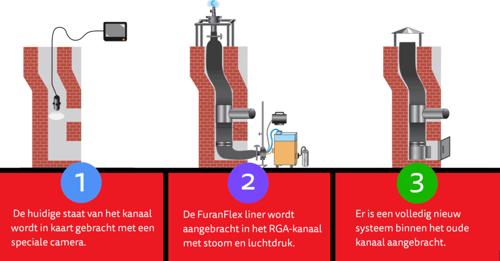 Met FuranFlex kunnen wij dit zónder breekwerk volledig vanuit het bestaande kanaal voorzien van een nieuwe liner die voldoet aan alle wettelijk gestelde eisen.